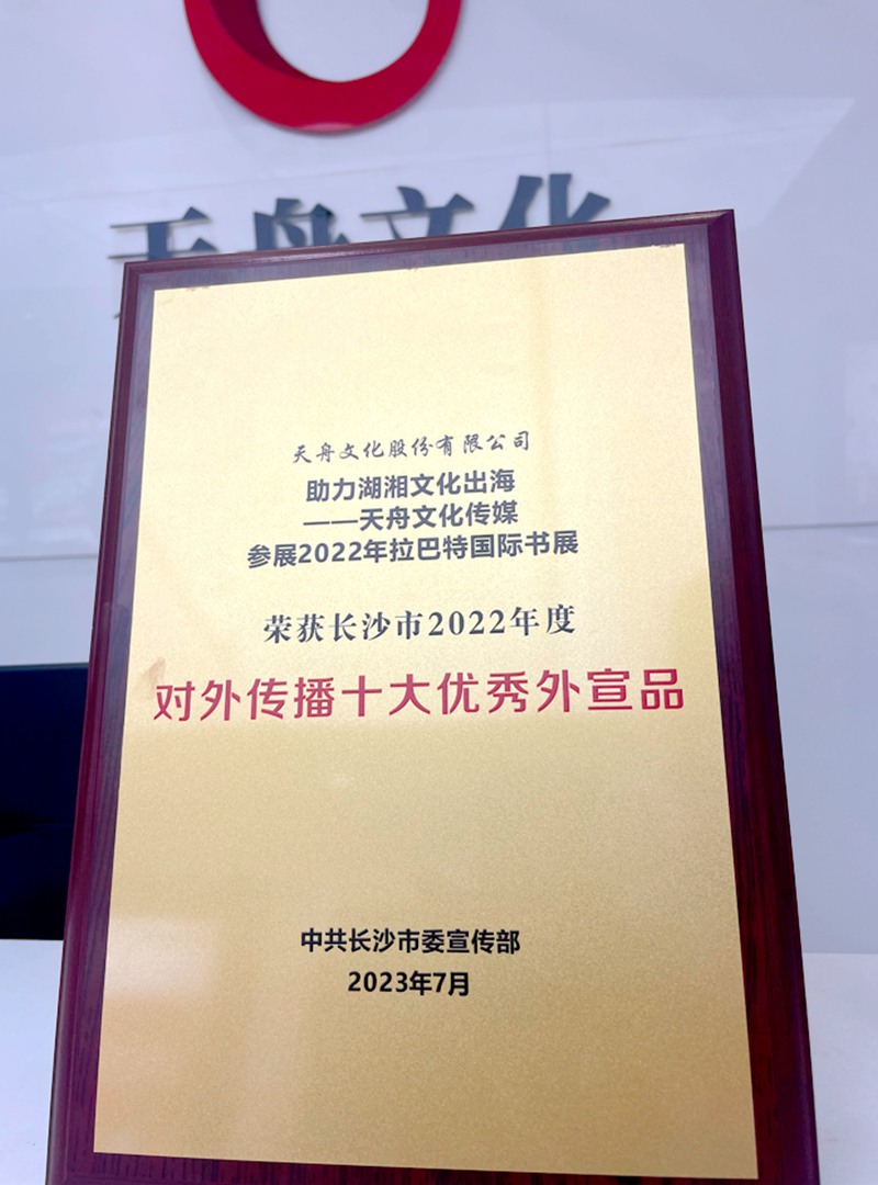 会上,2022年长沙市十大对外传播优秀案例、外宣品、外宣图片获奖作品受到表彰。天舟文化股份有限公司报送的“助力湖湘文化出海——天舟文化参展2022年拉巴特国际书展”作品荣获“2022年度长沙市优秀文化外宣品”。