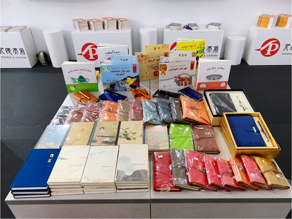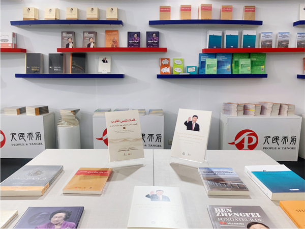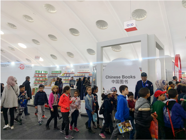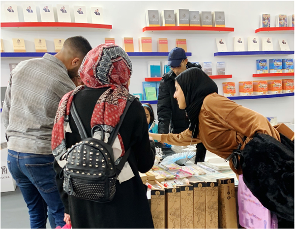 中国展区是本届书展中面积最大的展区之一。此次书展,人民天舟为当地读者准备了一百余种、六千余册阿语、法语、英语精品图书,重点展出了新近出版的《平“语”近人——习近平总书记用典》阿语版等主题图书;同时还根据当地少儿读者的需要,展出了《我要飞》(阿语版)、《米莉茉莉和莉莉成长故事》系列(英语版)、科普绘本《漫画十万个为什么》系列(法语版)等一大批优秀少儿图书,以及反映中国传统文化的《我心中的少林》(英语版)、《少林功夫》(英语版)等书籍、具有中国特色的文创产品等。中国展台很受读者喜爱,每天都有众多读者在展台翻阅与购买相关图书。