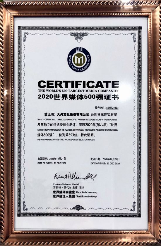 12月22日,由世界媒体实验室和世界经理人集团联合编制的2020年度(第八届)《世界媒体500强》排行榜在美国纽约揭晓,天舟文化凭借在营收数据、品牌影响力及国际化布局方面的显著优势,连续七年入选“世界媒体500强”榜,排名由第406名跃居到第393名。