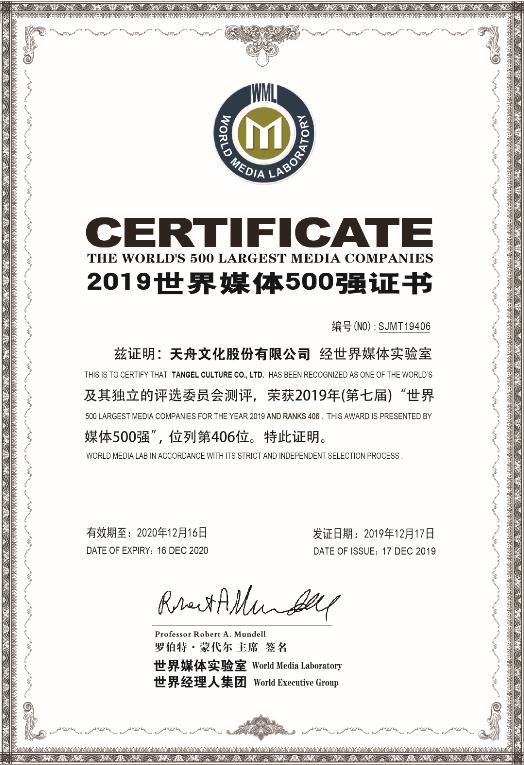 12月17日,由世界媒体实验室(World Media Lab)独家编制的2019年度(第七届)《世界媒体500强》排行榜在美国纽约揭晓,天舟文化凭借出色的营收数据、优异的品牌影响力及国际化的业务布局,连续第6年入选“世界媒体500强”榜,排名跃居第406名。