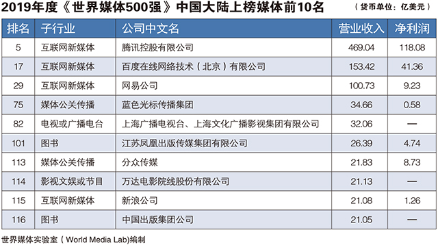 据悉,此次评选共有来自美洲、欧洲和亚洲40多个国家和地区的3000多家媒体公司参与,涉及电视/广播电台、报纸、图书、期刊、互联网新媒体、有线宽频或卫星、综合媒体、影视文娱/节目及媒体公关传播等9个子行业。来自美国的谷歌(Google)、康卡斯特(Comcast)、迪斯尼公司(Walt Disney)凭借年营业收入位居榜单前三甲。中国(含港澳台)今年共有95家媒体公司入选,仅次于美国位居第二,平均营业收入13.84亿美元,再次超越日本成为亚洲第一媒体大国。腾讯、百度、网易为中国大陆上榜媒体前三甲,分别位居第5名、第11名及第29名。
