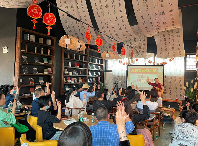 阳春三月,春风扑面。3月13日下午,为宣传贯彻《家庭教育促进法》精神,天舟文化在长沙市铜官窑草市海阅堂举办主题为“让孩子成长的三把金钥匙”的家庭教育智慧营公益讲座。本次活动由天舟文化股份有限公司主办,海阅堂承办,特别邀请六和先生作为本期的主讲导师。40余名学员到场参加了本次活动。